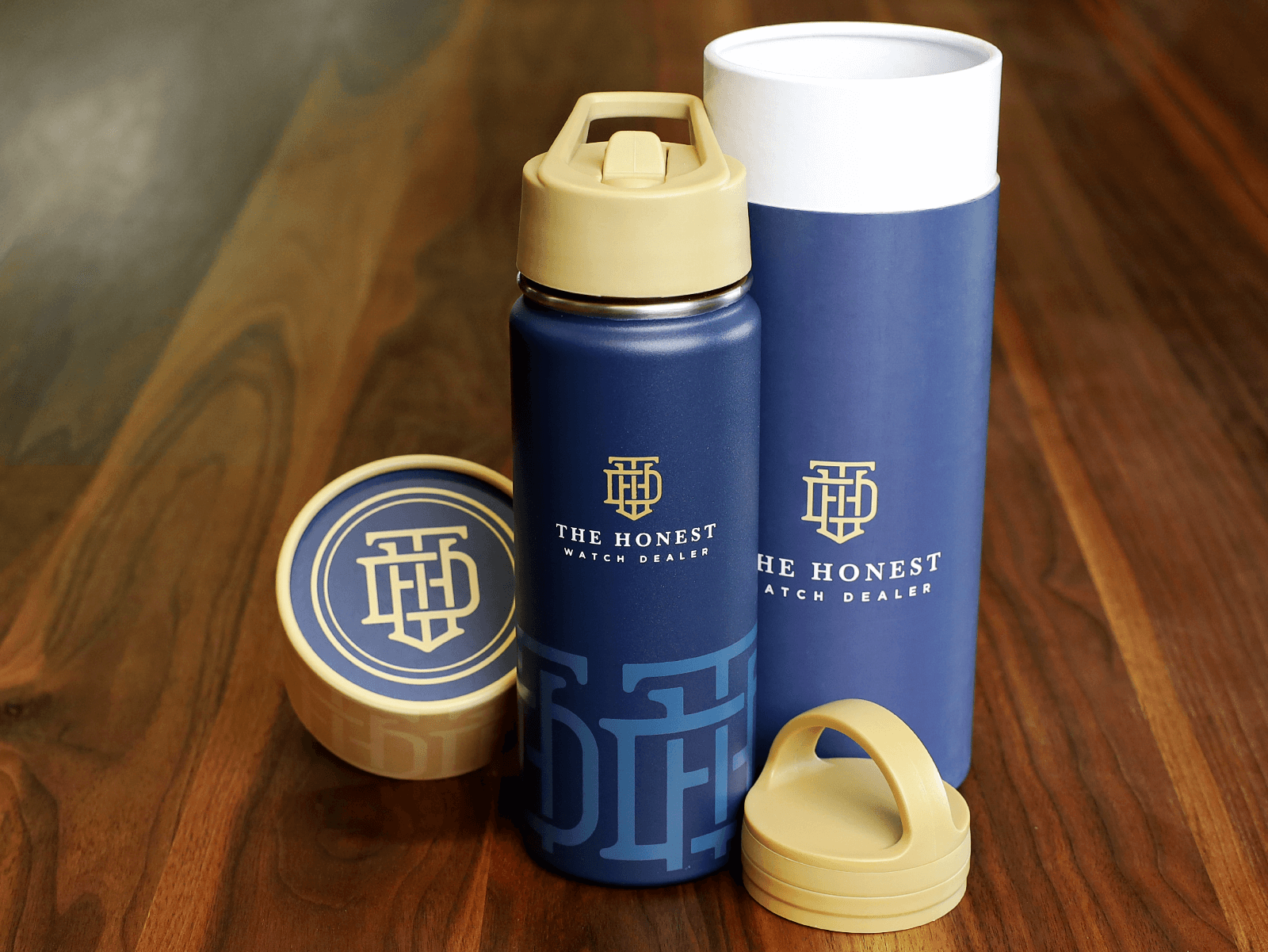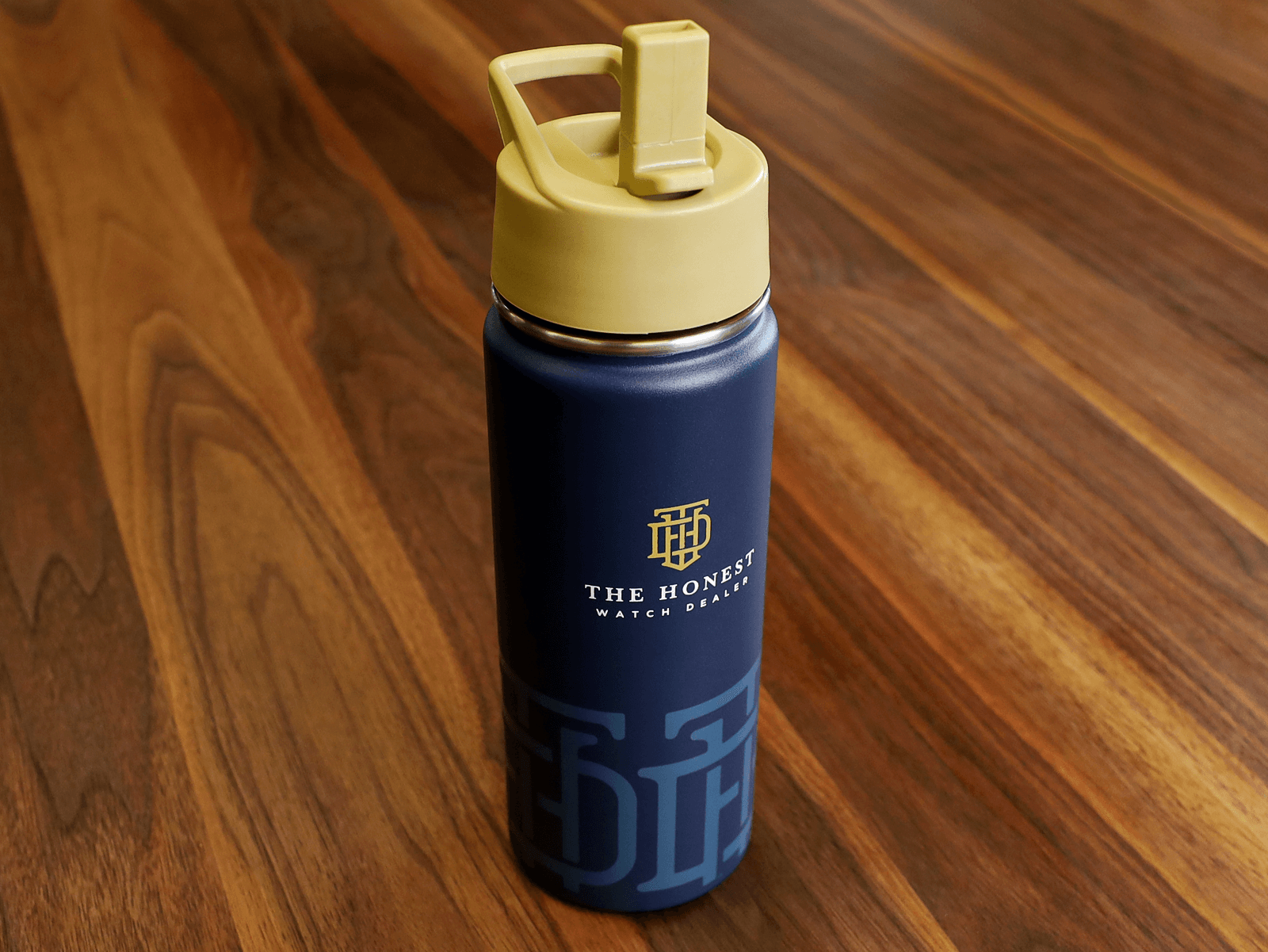 THE HONEST WATCH DEALER BLUE AND GOLD STAINLESS STEEL DRINKS CONTAINER WITH BOX