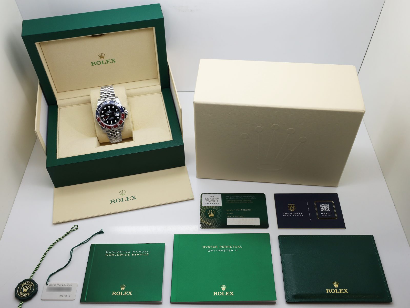 GENTS ROLEX GMT-MASTER II PEPSI 126710BLRO STAINLESS STEEL WARRANTY STICKERS 2024 UK B&P