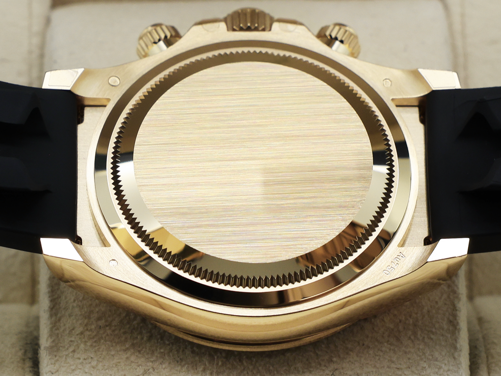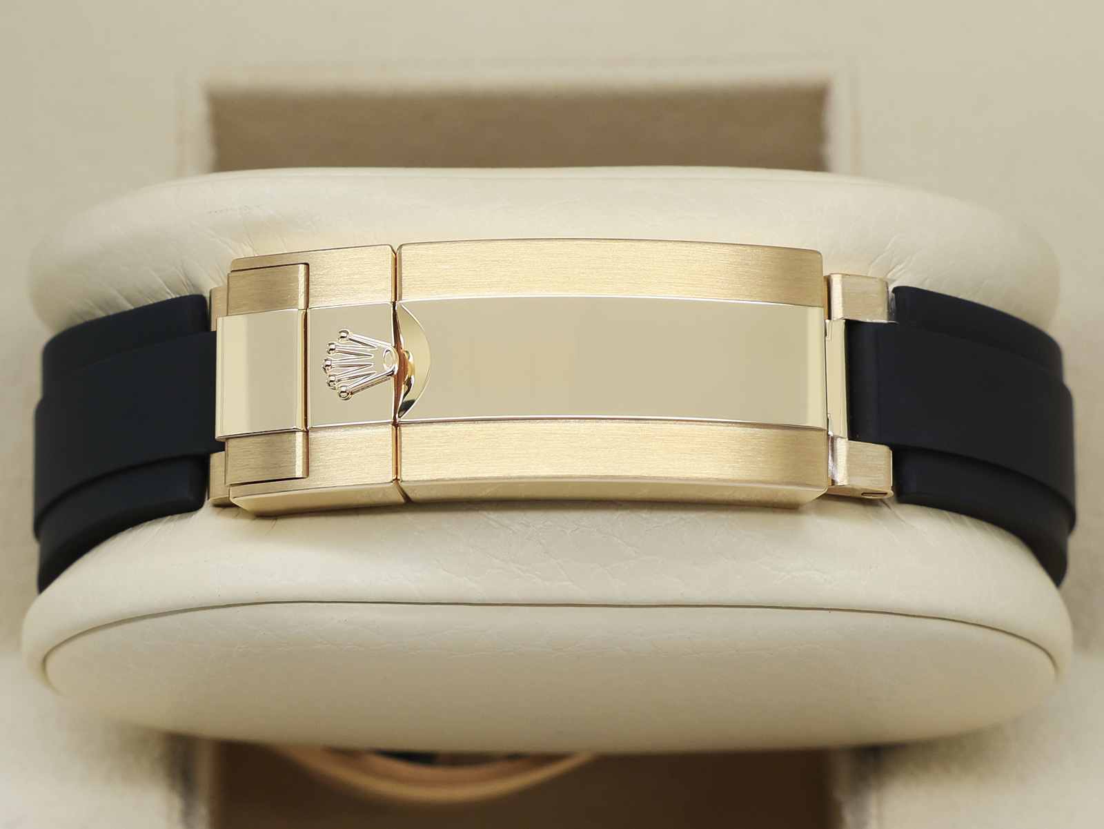 The Rolex Factory Black Rubber Oysterflex Strap is Fitted with the 18ct Yellow Gold Double Folding Safety Clasp and Glidelock.