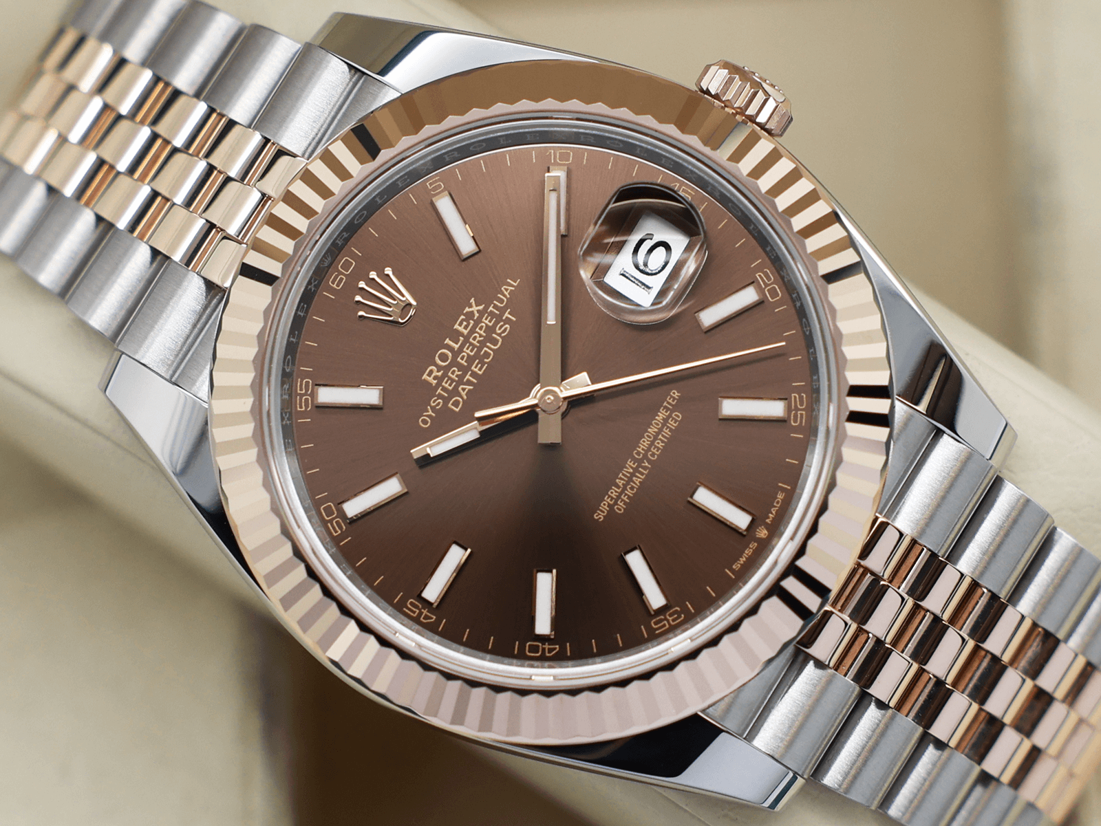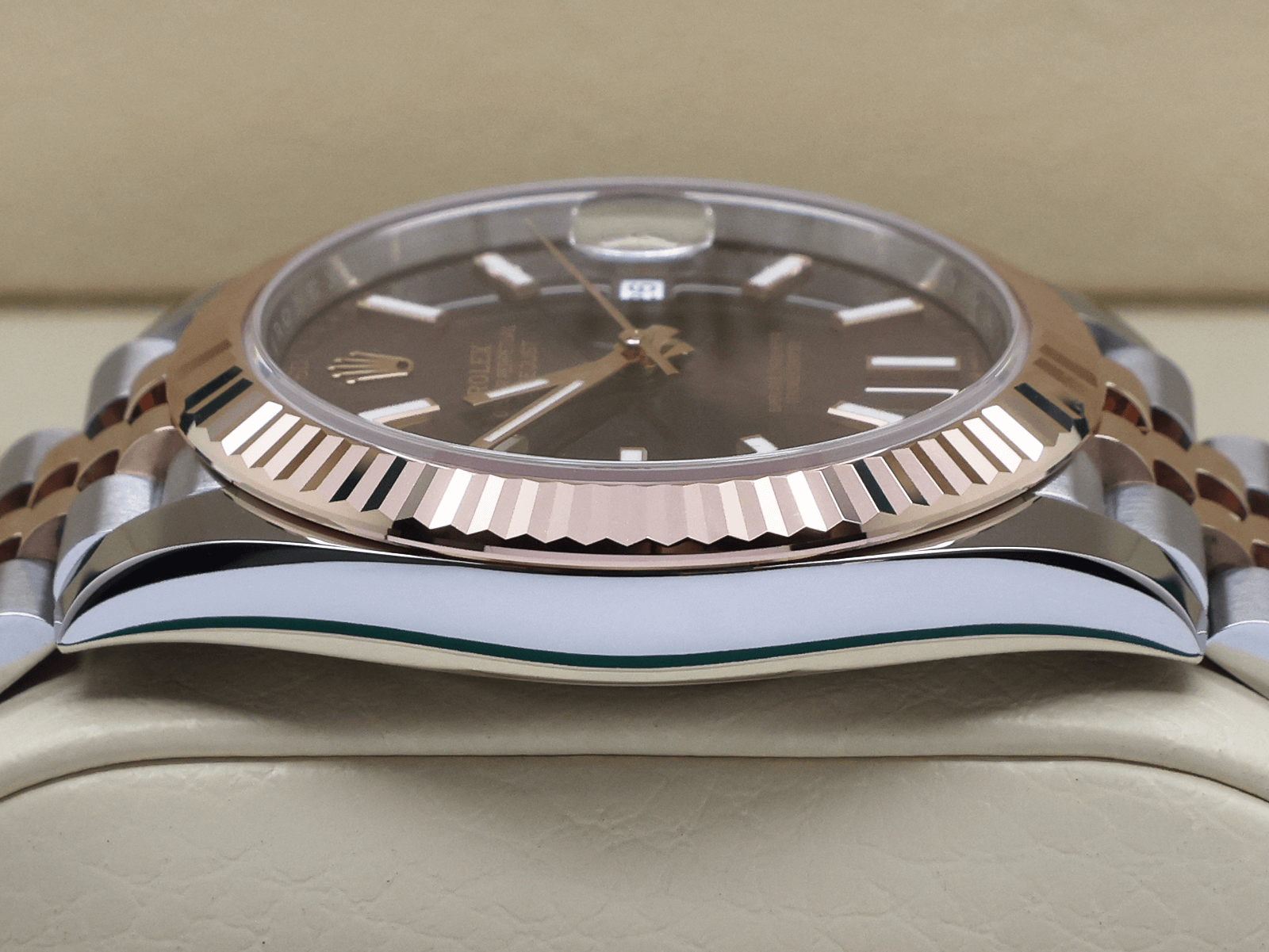Stunning Gents Rolex Datejust 41mm Watch in 18ct Rose Gold and Stainless Steel with a Chocolate Dial and 18ct Rose Gold Fluted Bezel.