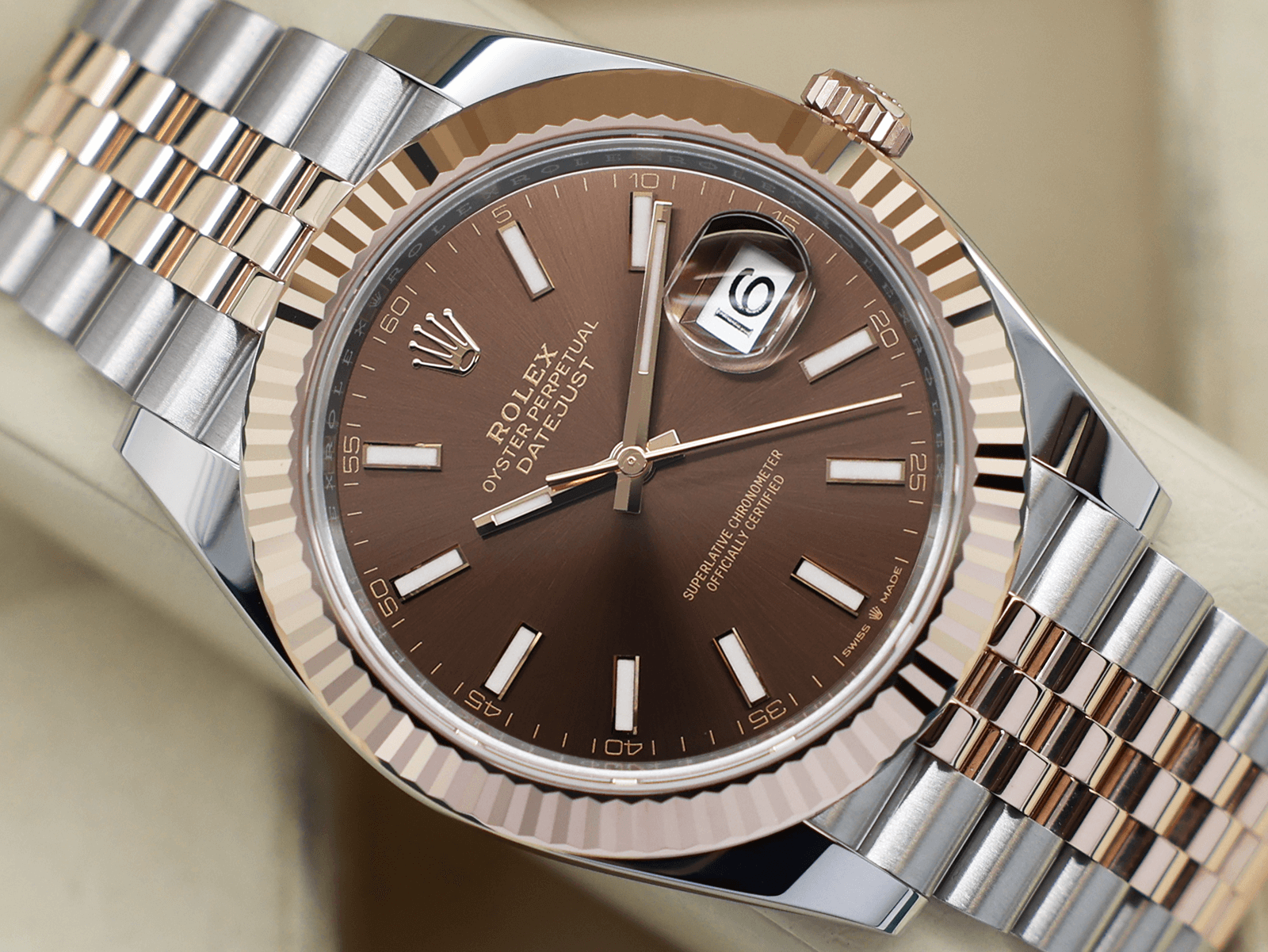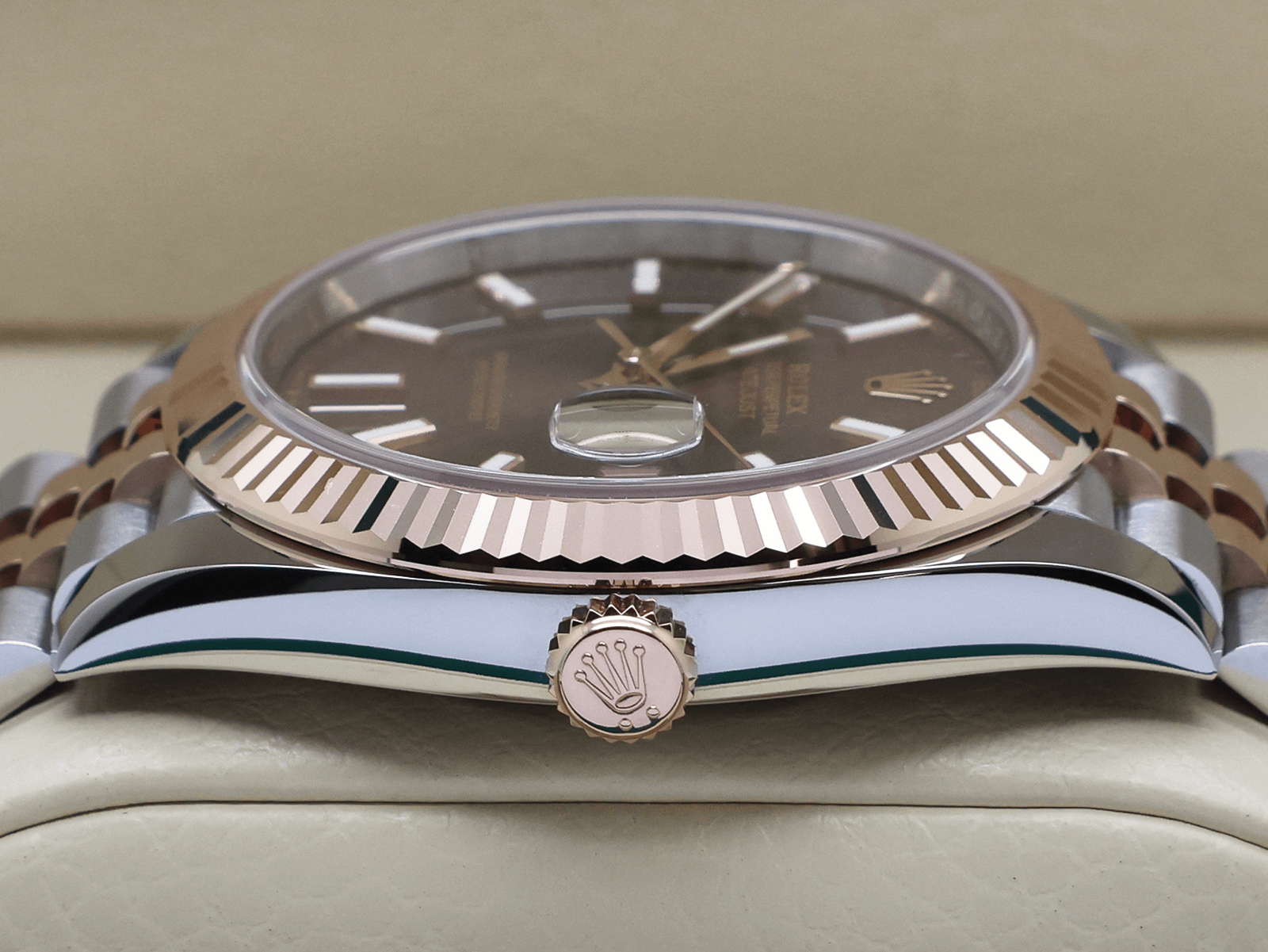 Stunning Gents Rolex Datejust 41mm Watch in 18ct Rose Gold and Stainless Steel with a Chocolate Dial and 18ct Rose Gold Fluted Bezel.