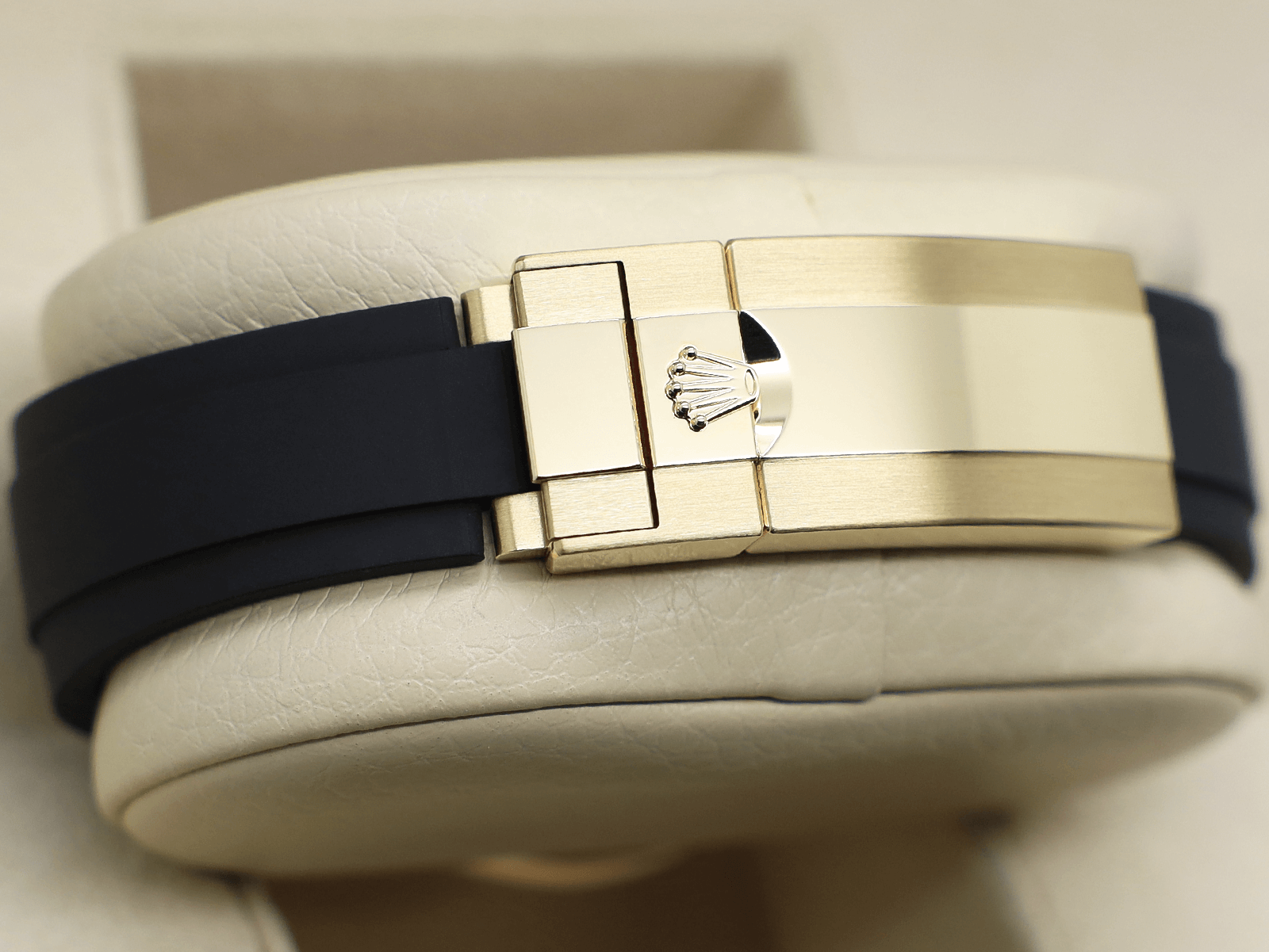 The Rolex Factory Black Rubber Oysterflex Strap is Fitted with the 18ct Yellow Gold Double Folding Safety Clasp and Glidelock.