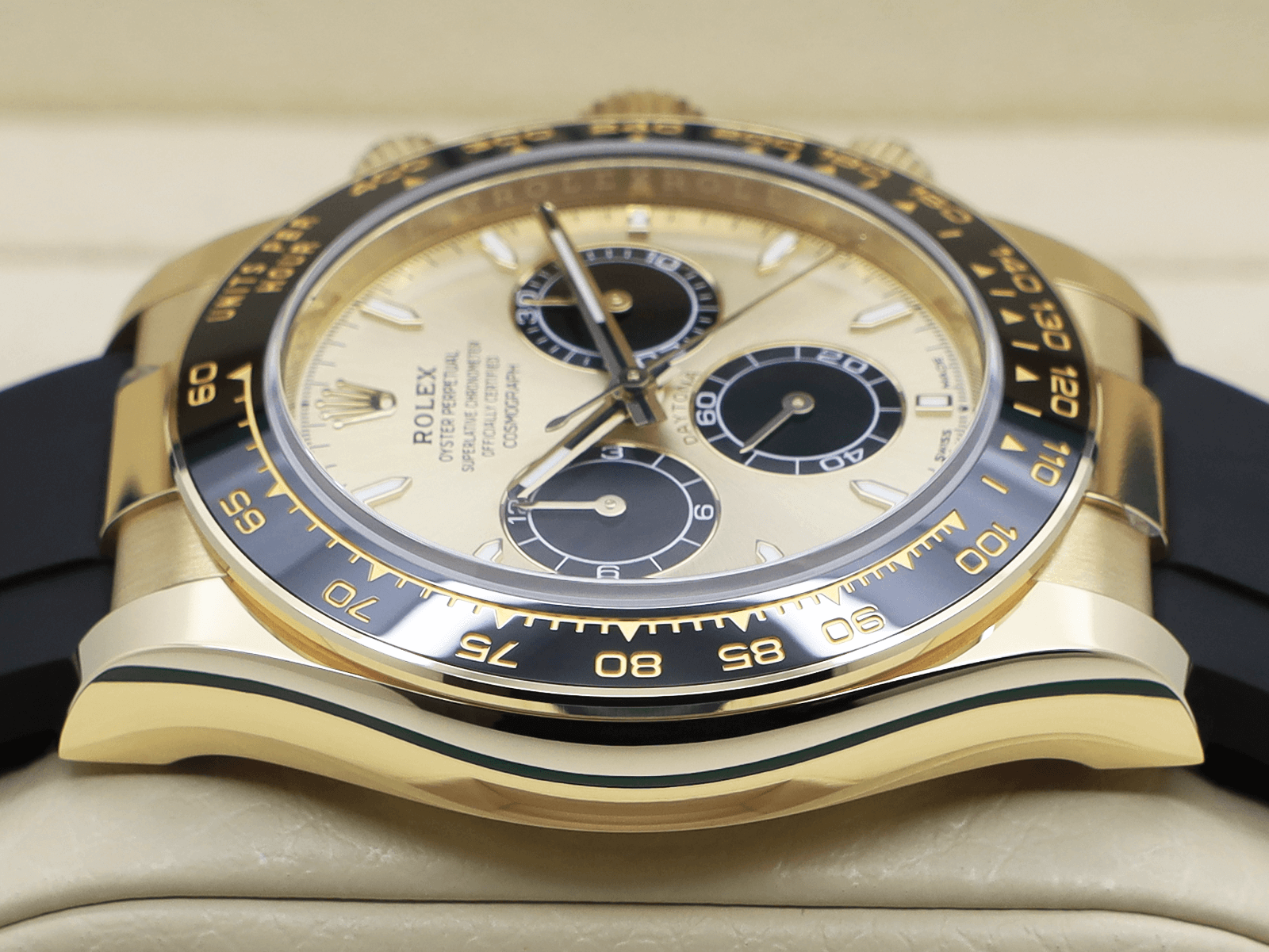 Stunning Gents Rolex Daytona “New Model” Watch in 18ct Yellow Gold with a Champagne ‘Pikachu’ Dial and 18ct Yellow Gold Bezel with a Black Ceramic Insert Set with Numerals on The Black Rubber Oysterflex Strap with 18ct Yellow Gold Safety Clasp.
