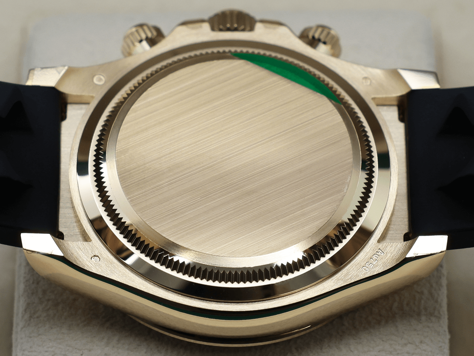 The Rolex Factory Black Rubber Oysterflex Strap is Fitted with the 18ct Yellow Gold Double Folding Safety Clasp and Glidelock.