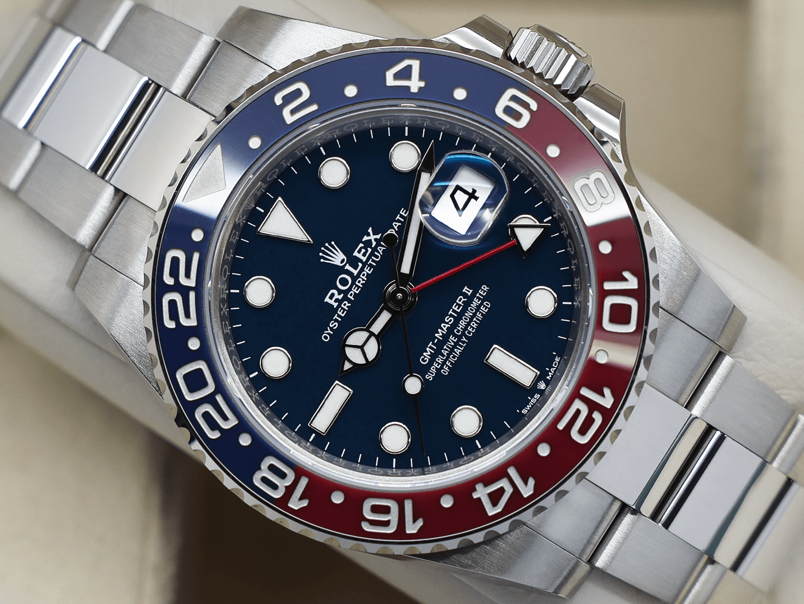 Stunning Gents Rolex GMT-Master II “Pepsi” Watch in 18ct White Gold with a Blue Dial and Solid 18ct White Gold Rotating Bezel with a Blue and Red Ceramic Insert.
