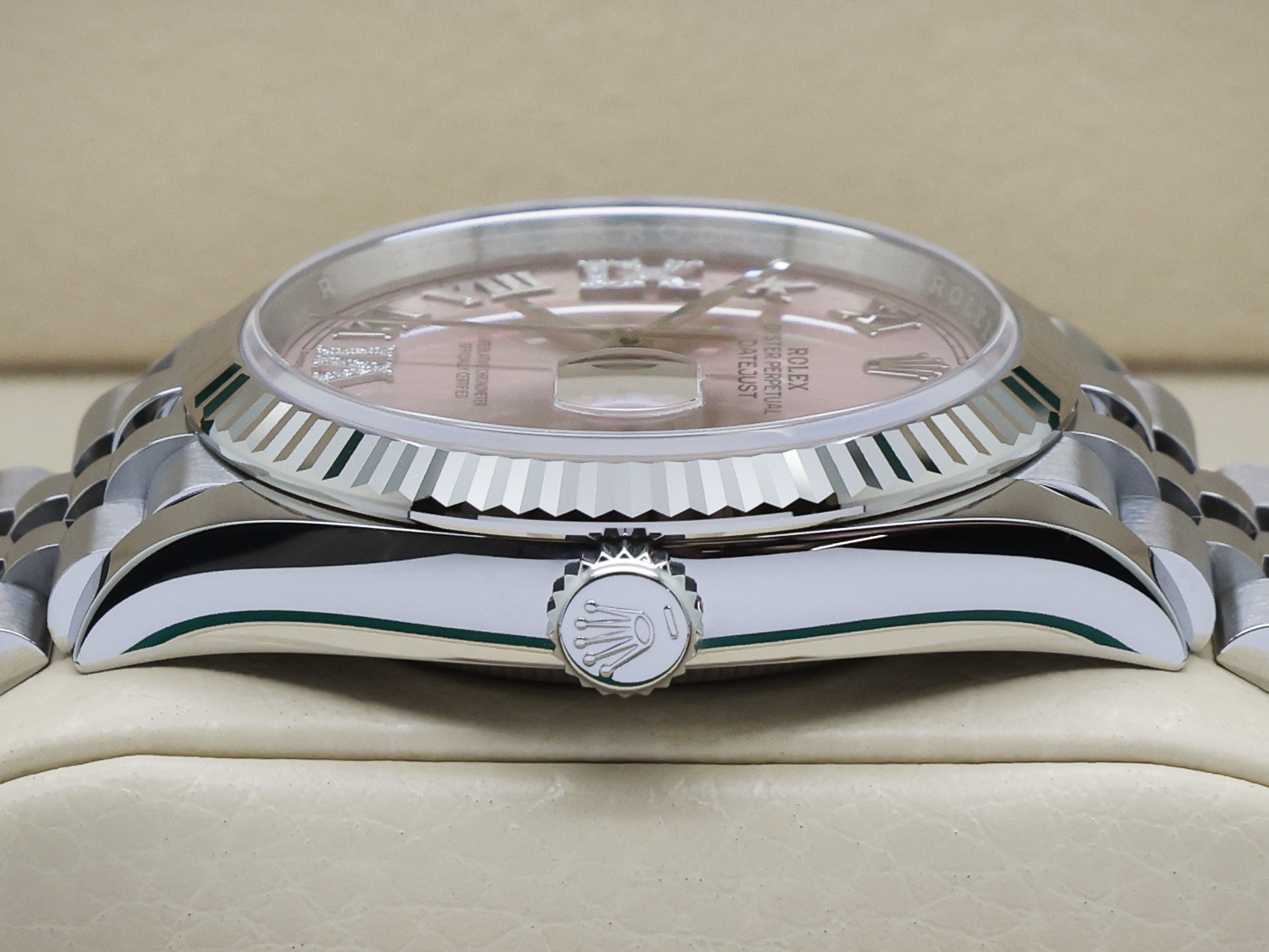 It has The Stunning Highly Sought After Factory Pink Dial Set with 18ct White Gold Diamond Roman Numeral Markers at 6 and 9, 18ct White Gold Rolex Crown and 18ct White Gold Hands.