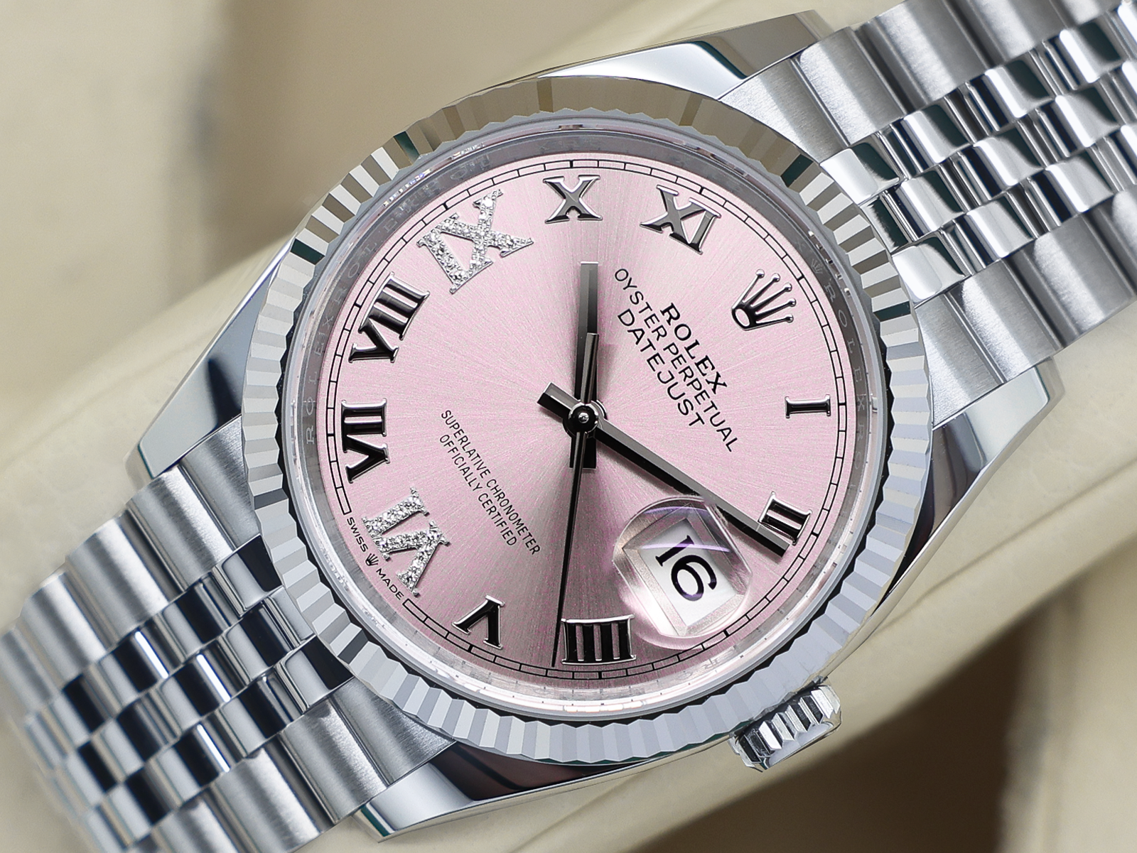 Stunning Ladies Rolex Datejust 36mm Watch in Stainless Steel with a Pink Roman Numeral Diamond Dial and Solid 18ct White Gold Fluted Bezel on a Stainless Steel Jubilee Bracelet.