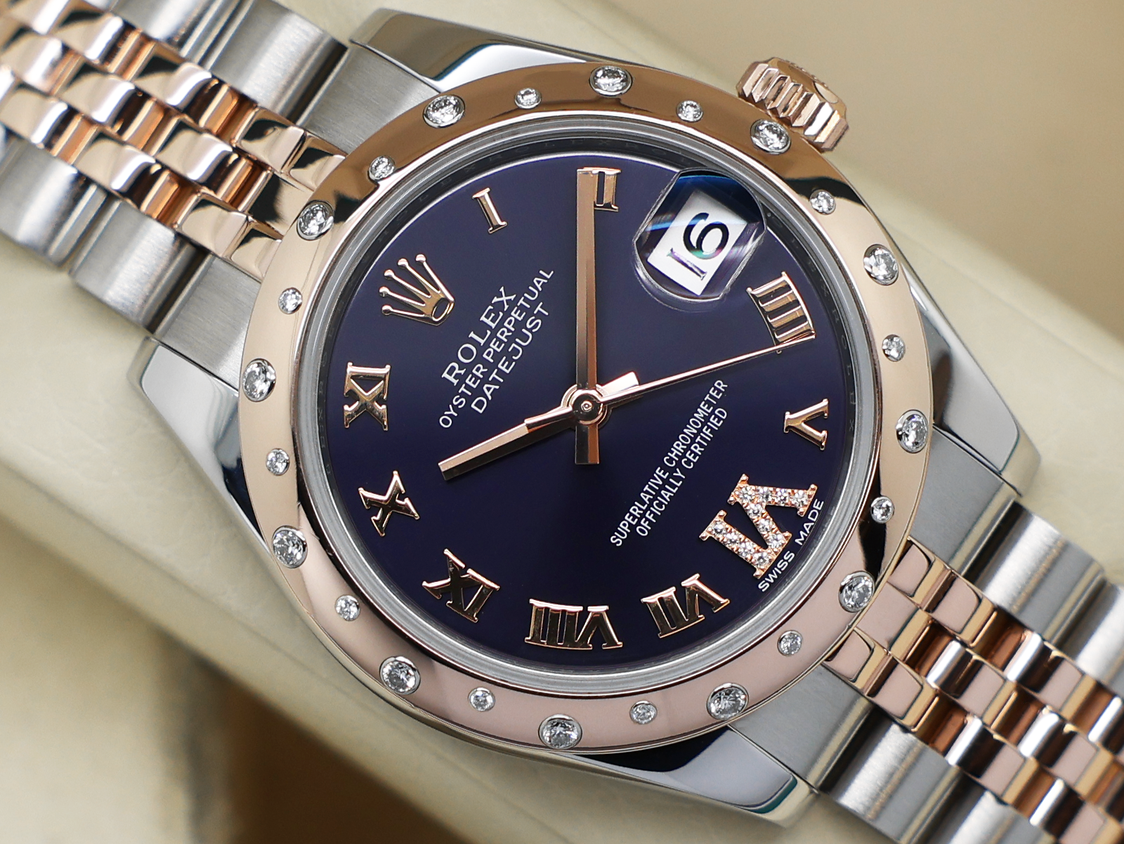 Stunning Ladies Rolex Datejust Midsize 31mm Watch in Stainless Steel with a Aubergine Roman Numeral Diamond Dial and Solid 18ct Rose Gold Diamond Scatter Bezel.