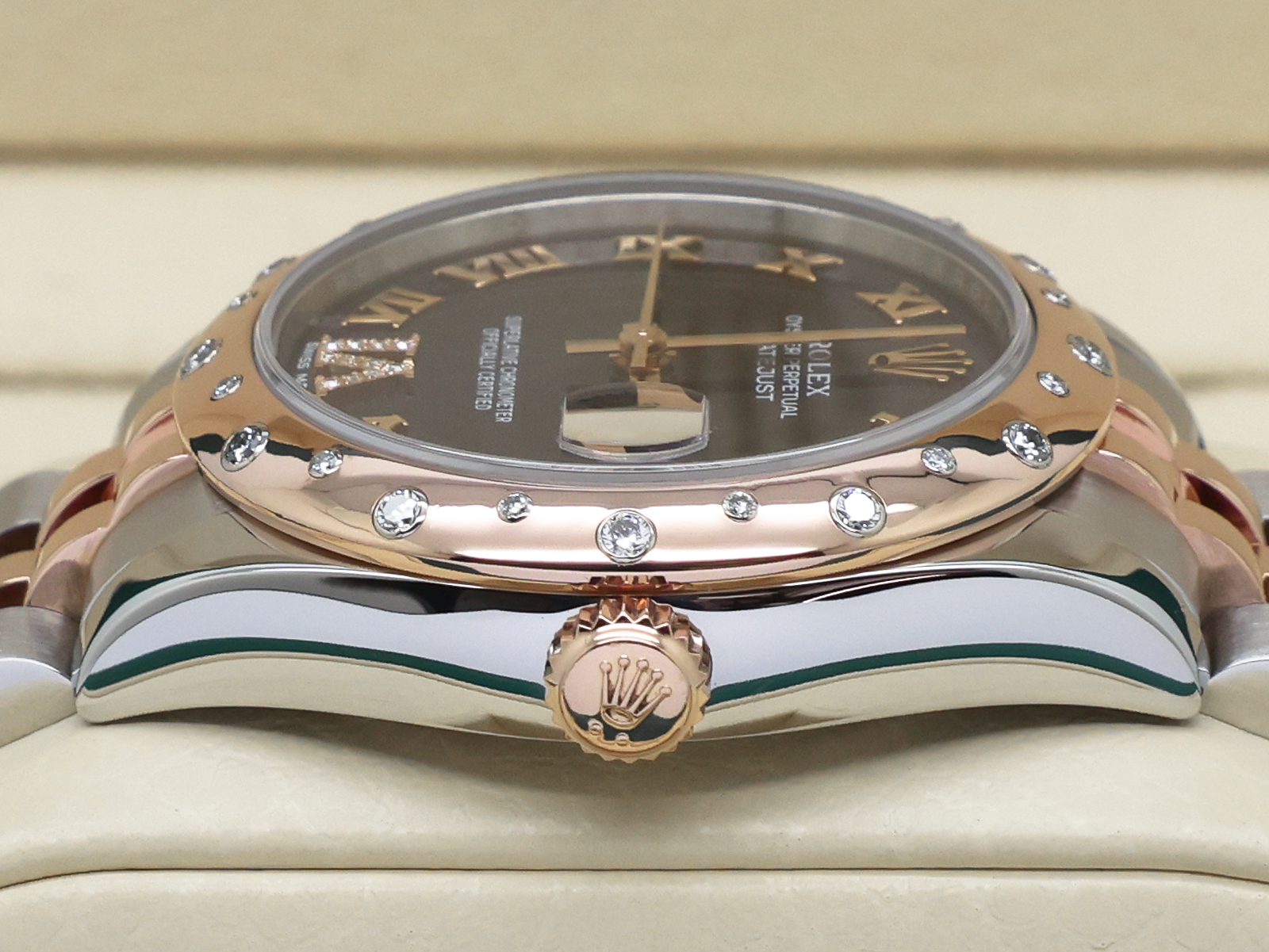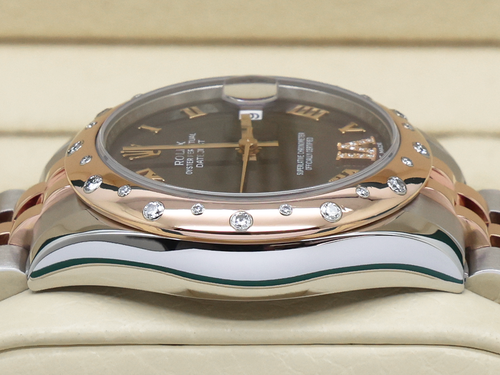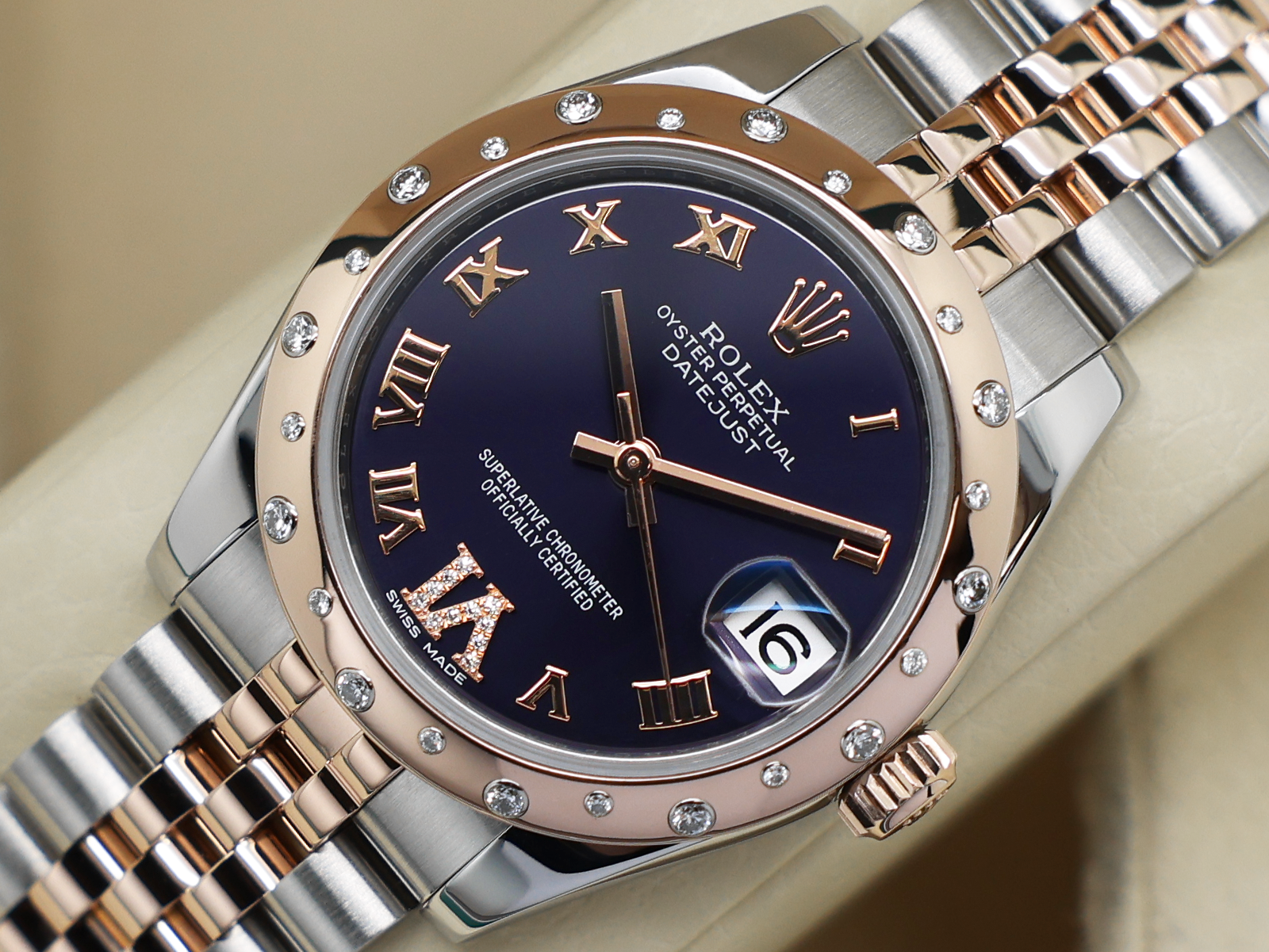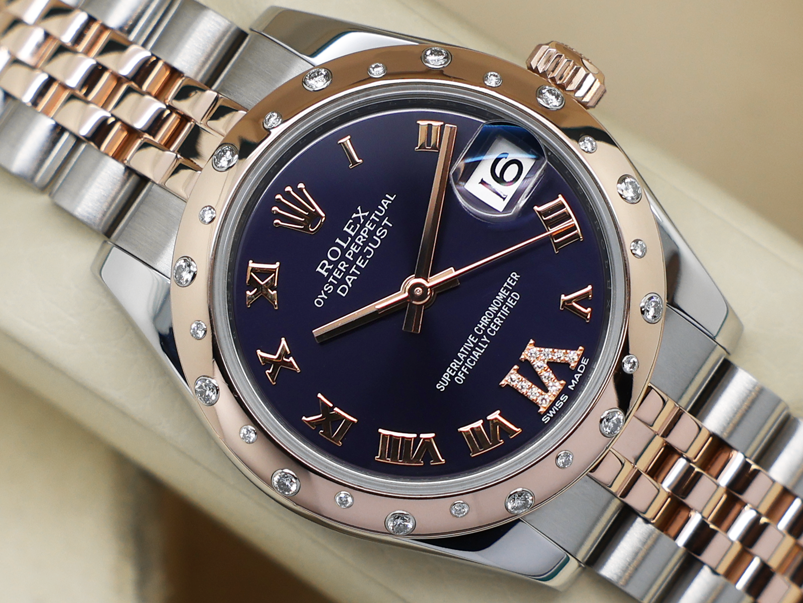 Stunning Ladies Rolex Datejust Midsize 31mm Watch in Stainless Steel with a Aubergine Roman Numeral Diamond Dial and Solid 18ct Rose Gold Diamond Scatter Bezel.
