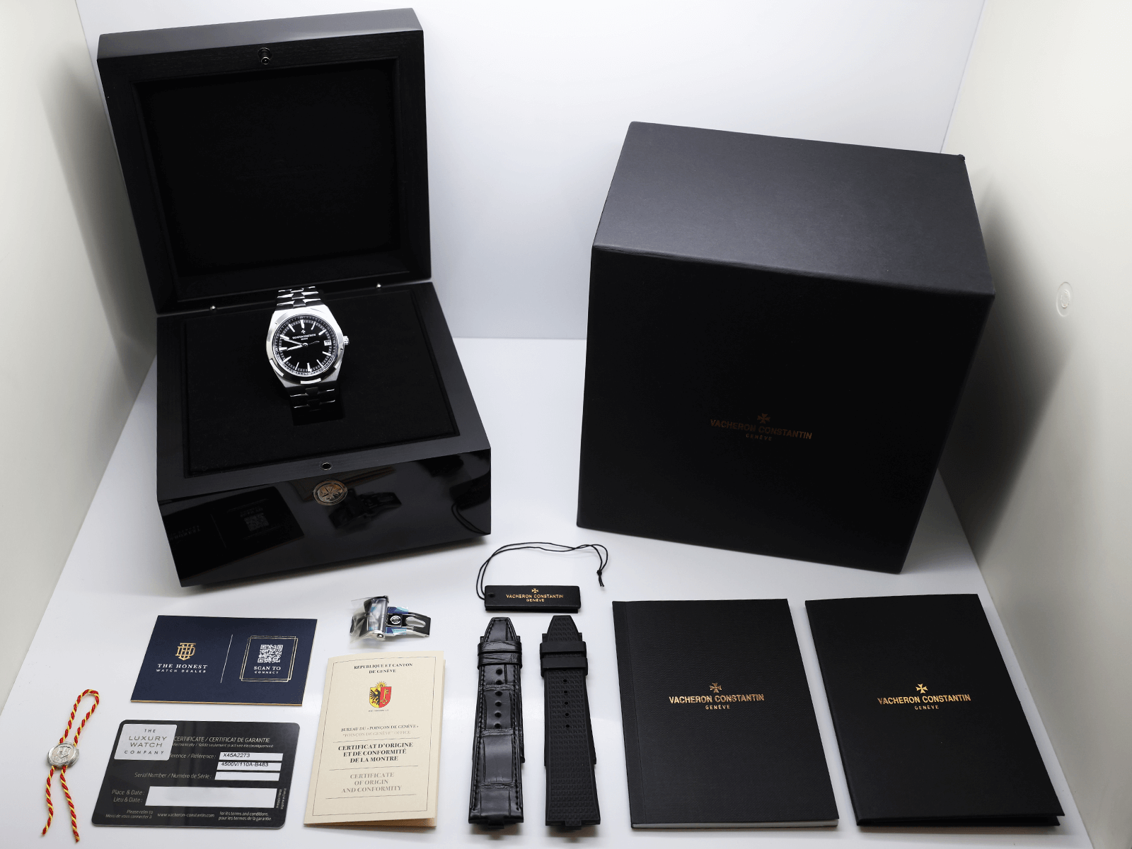 This is a Fantastic Gentleman’s Timepiece With The Stunning Black Dial. The Watch Comes Supplied in Outstanding Condition with A Fully Complete Collectors Set Supplied With The Original Vacheron Constantin Black Wooden Inlay Box, Outer Box, Instruction Booklet, Vacheron Constantin Authenticity Certificate and Additional Stainless Steel Double Folding Clasp.